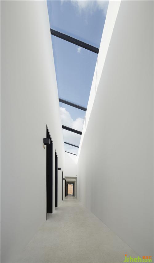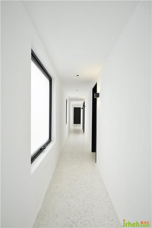 將輔助空間作為整個(gè)建筑的通道路徑,串聯(lián)起各個(gè)功能區(qū),受制于場(chǎng)地條件,上海酒店民宿通道呈現(xiàn)狹長(zhǎng)的形態(tài),裝修設(shè)計(jì)上,以純白色柔和光線不足帶來(lái)的幽閉感,二層部分使用了挑高處理,增加空間的層次,頂面狹長(zhǎng)的天窗將自然光線引入通道,給行走的路徑帶來(lái)一份不確定的驚喜。