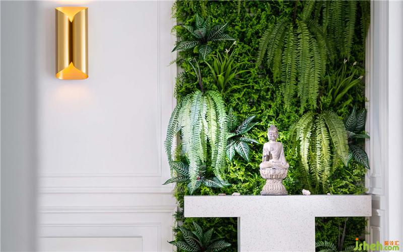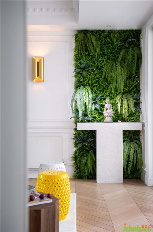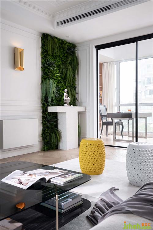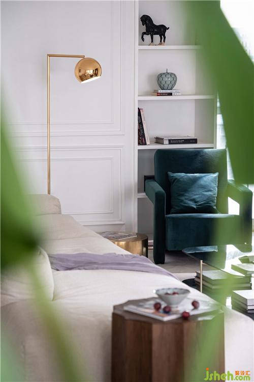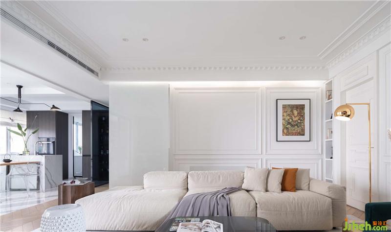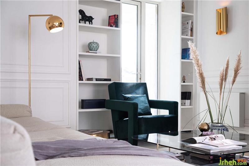 The wall of the living room is made of white background, and the simplified European design can be seen on the line board, and the south wall is all treated as a bookcase to expand the room space. The hanging paintings behind the sofa are extremely rare, and they are part of the Dunhuang frescoes that were cut and copied.