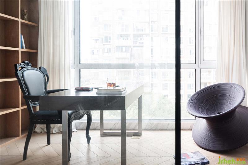 地面通過(guò)塊面切割和材質(zhì)變換提升設(shè)計(jì)感,同時(shí)讓沉潛的空間多了變化與層次;北書房原來(lái)是個(gè)小陽(yáng)臺(tái),設(shè)計(jì)將其拓展變大成為現(xiàn)在的功能性書房,無(wú)論工作還是休閑需要,都沉浸在安靜氛圍與充裕天光中。