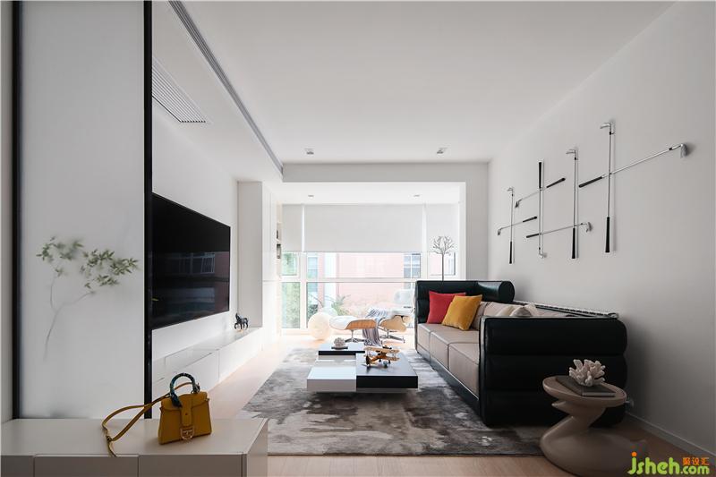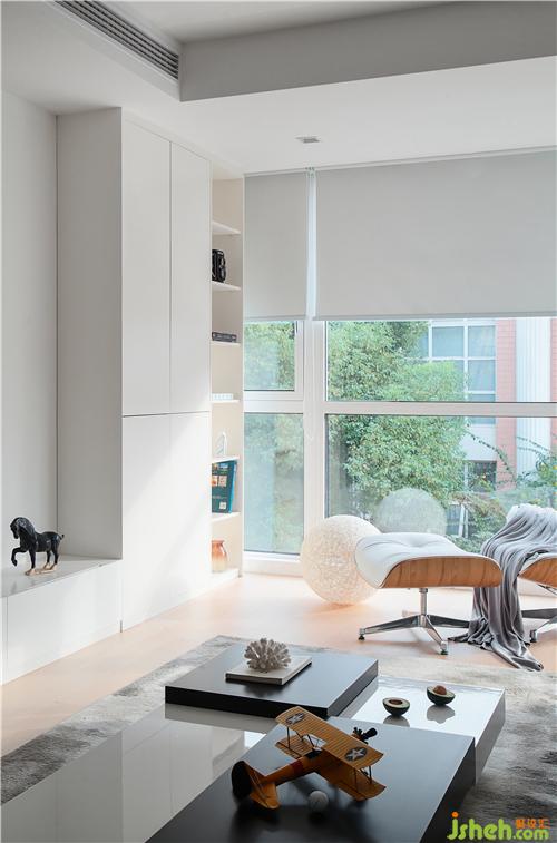 客廳面積較小,整體比例失衡,室內(nèi)設(shè)計(jì)師于是將陽(yáng)臺(tái)做成全落地玻璃結(jié)構(gòu)納入客廳范圍,這樣“去陽(yáng)臺(tái)化”的處理讓客廳視覺和實(shí)際感官都更為開敞,沙發(fā)、邊椅都可以放置其中。同時(shí),窗外的自然景物被引入室內(nèi),空間更加通透愜意。一組白色高柜陳列架既滿足日常小物的收納與展示,又消弭掉此處原本門洞遺留下的痕跡。
