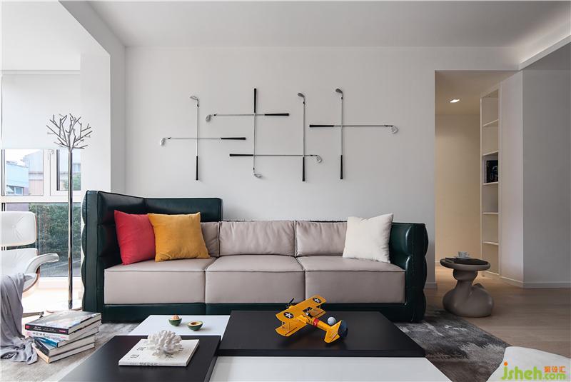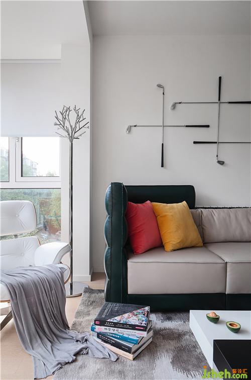 沙發(fā)背景墻有意保持潔凈,八根高爾夫球桿被用透明魚線以不同的排列組合方式懸吊固定,成為整個(gè)客廳的裝置背景,實(shí)際效果十分驚艷。魚線的使用不露聲色,而且對(duì)球桿和墻面的破壞很小,設(shè)計(jì)之用心自細(xì)微處可見。
