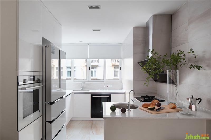 業(yè)主喜歡簡(jiǎn)潔清爽的生活空間,不希望有太多裝飾堆棧?;谒麄兊纳盍?xí)慣與方式,廚房采用了敞開式設(shè)計(jì),高柜加低柜組合滿足豐富的收納,半導(dǎo)體、吧臺(tái)的設(shè)置可以靈活使用。廚房與餐室之間沒有切隔,光線和視野可以自由游移,加大既有空間的明亮感和通透性。