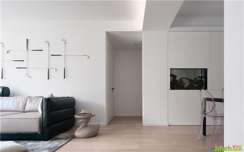 前文提到傅先生養(yǎng)魚的愛好,但市面上大都是柜式魚缸,空間占比大且很難和空間匹配形成良好對(duì)話??紤]到原本過道與餐廳之間的尷尬局面(按原戶型,無論從北房間還是南房間出來往客廳走,一出來看到的就是餐桌),索性將過道封掉做成魚缸,同時(shí)從兒童房里切出一個(gè)不影響整體的1.5㎡的角,變成公共過道區(qū)。