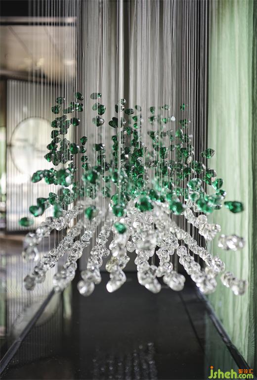 水起成云,遨游萬里;水落成雨,滋養(yǎng)大地;水流成河,哺育生命。綠色水晶打造山脈意象,感受山水詩意,交融共生,借以致敬自然之美。
