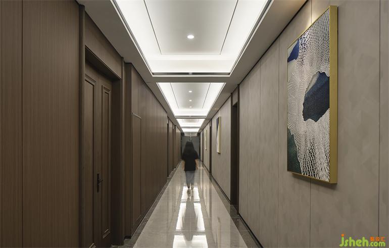 走廊延續(xù)辦公區(qū)裝修風(fēng)格,商務(wù)辦公樓設(shè)計(jì)空間簡(jiǎn)潔秩序,深色木紋和淺色墻板,形成鮮明對(duì)比,豐富了空間層次感。