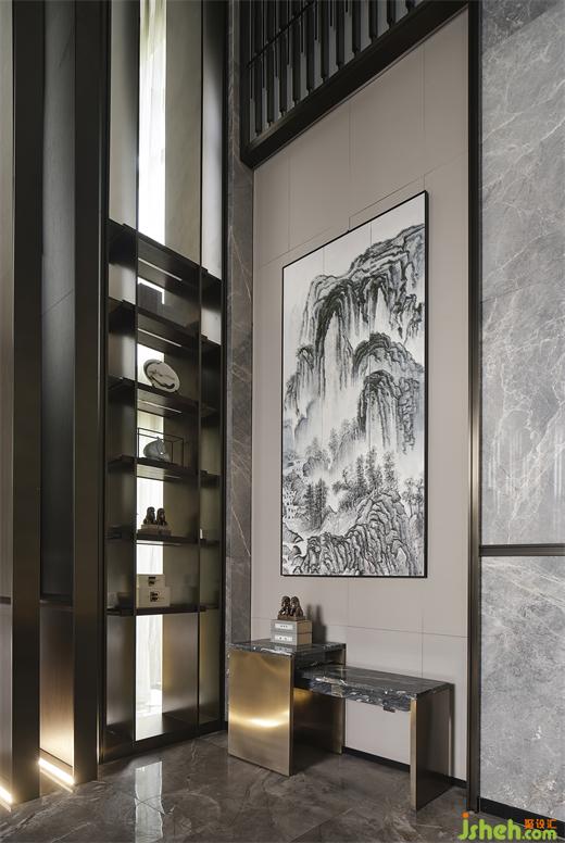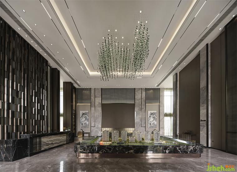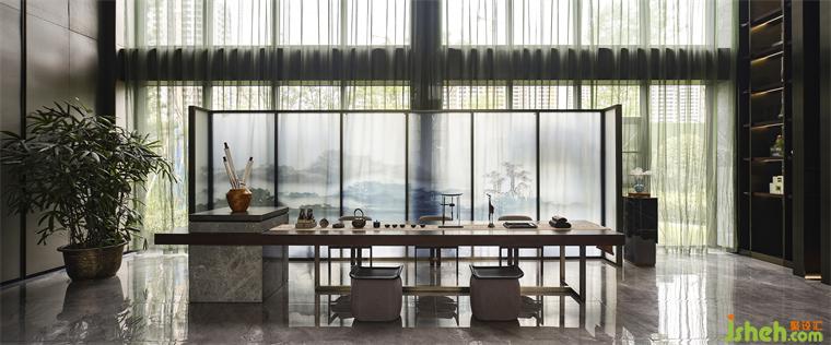 水墨屏風(fēng)裝置的設(shè)計,是大堂的一大亮點,營銷中心設(shè)計不僅將空間做了一個完美分割,還增強了空間層次感。