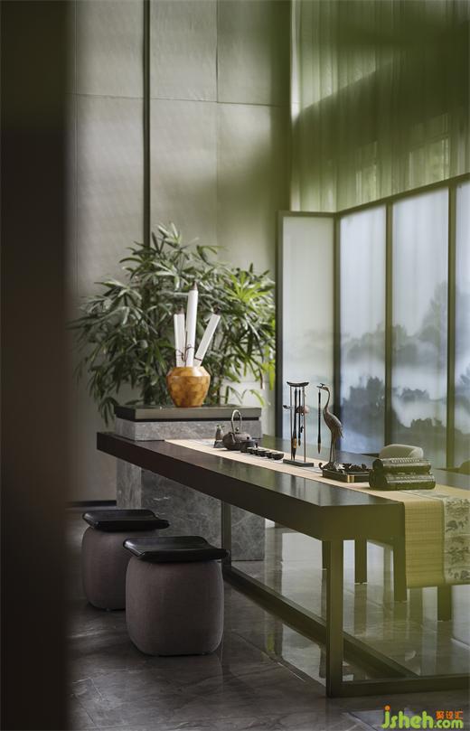 室內(nèi)薄紗清透,透過自然光影變化,點綴燈具散發(fā)的柔和微光,一片素雅柔和的東方氣韻縈繞其中。