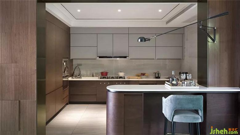 客廳以四米挑高空的優(yōu)勢,簡約內(nèi)斂的手法,調(diào)和高級灰與溫潤棕的木飾面,利用多種不同材質(zhì)組合空間,有光亮的色調(diào)與黯淡的色調(diào)穿插對比。簡約高雅的沙發(fā)和灰白錄拼色地毯相呼應(yīng),原裝西班牙Nomom大掛鐘的掛飾手法采用曲線與非對稱線條構(gòu)成,空間的每一處軟裝混搭設(shè)計都恰到好處。開放式餐廳滿足90后熱情好客的生活習(xí)慣,餐廳、客廳完全自由連接,環(huán)繞型動線確保各功能區(qū)之間的順暢流轉(zhuǎn),運用錯落有致的長線型吊燈,軟化空間的圓形天花,勾勒出視覺宣視點。
