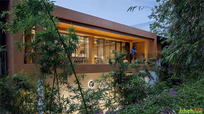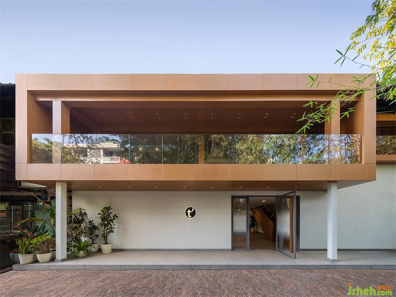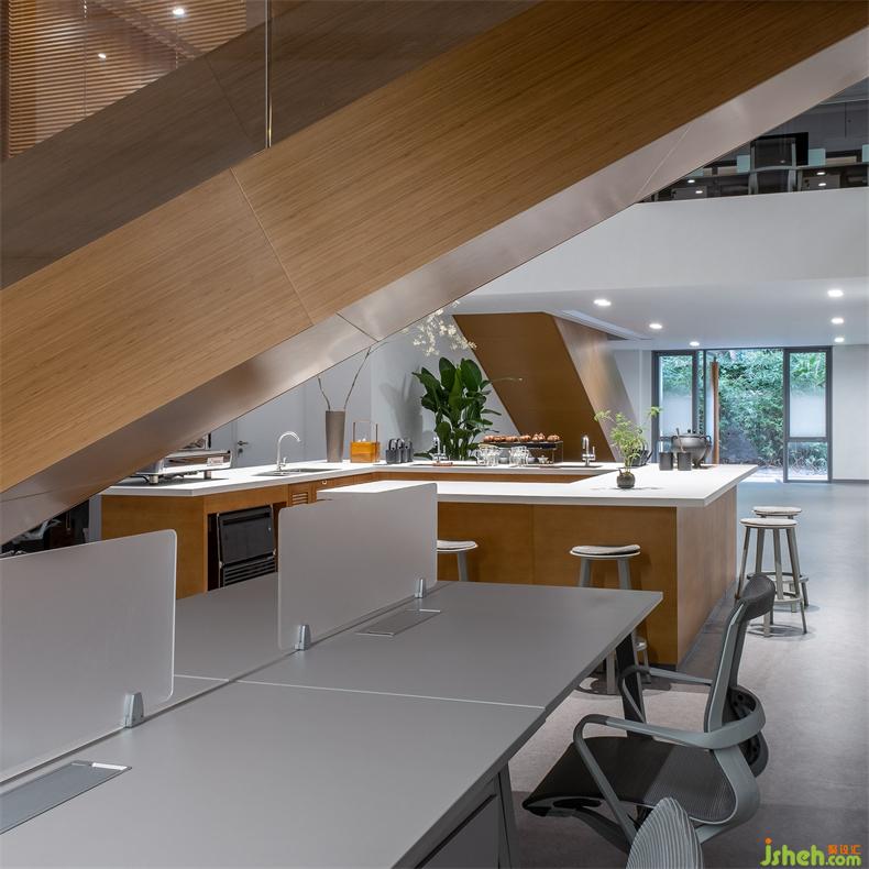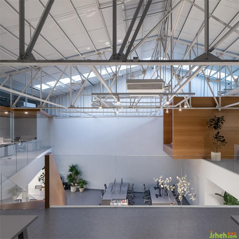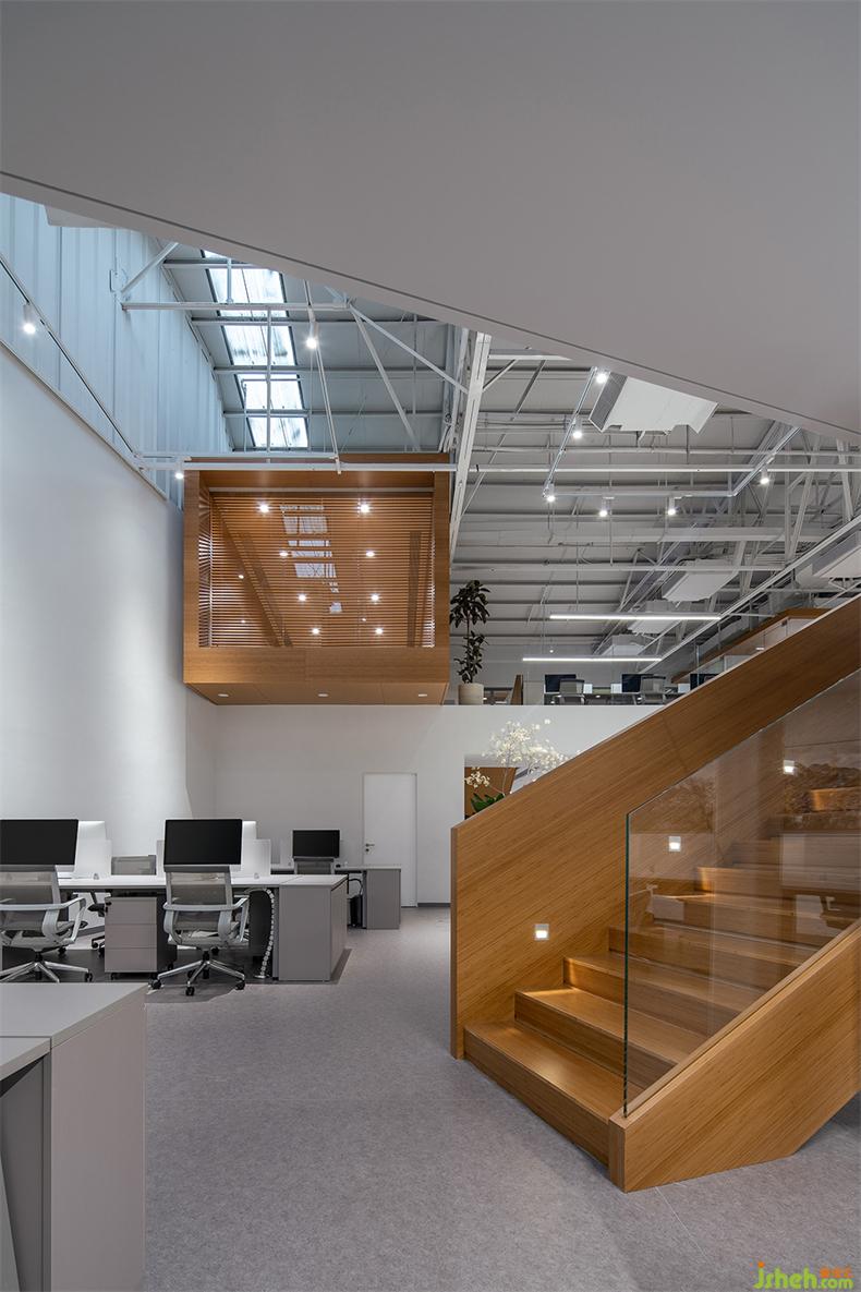 在二層置入兩個(gè)木色盒子,提供一個(gè)讓建筑、人與自然交互的接觸面。辦公室設(shè)計(jì)一個(gè)盒子平行于建筑面寬,提升顏值充當(dāng)陽(yáng)臺(tái);另一個(gè)盒子與之垂直,獨(dú)立存在于室內(nèi)空間,通過(guò)倆端的開(kāi)窗聯(lián)通室內(nèi)外,形成自然和室內(nèi)的對(duì)話,用于分享靈感和溝通討論。