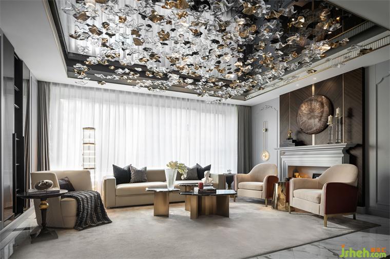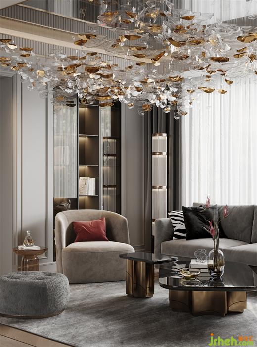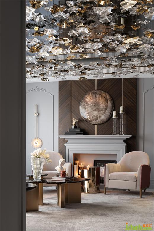 起居空間頂面以灰鏡擬態(tài)蒼穹玄夜,懸以水晶,如垂列星、如水漣漪、璀璨晶瑩、光映微庭。世事庸擾間,信仰的蒼穹仍然閃耀,仍然承載著自由、創(chuàng)造、以及某種幸福的形象,樣板房設(shè)計將一種意料之外的視覺刻畫與理性之美,結(jié)合地很好。