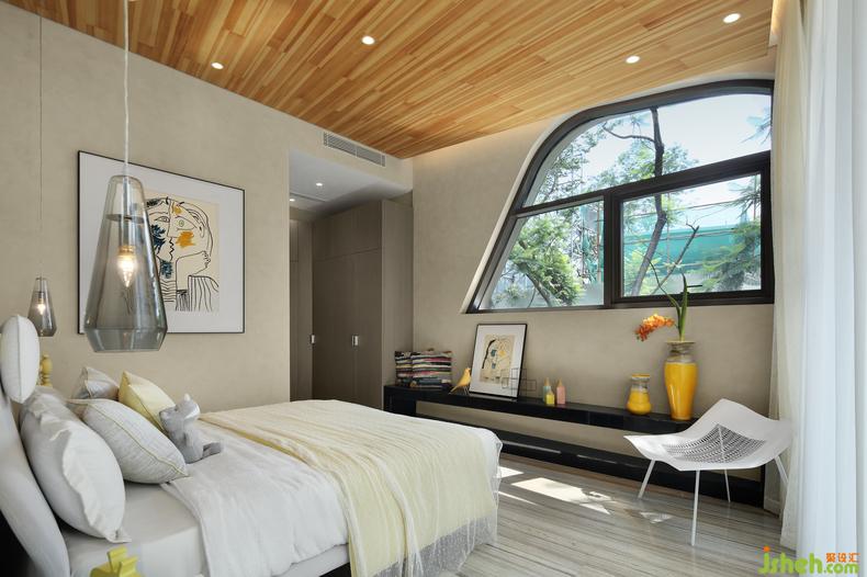 臥室在繼承整體空間現(xiàn)代感強(qiáng)烈的幾何線面之外,介入細(xì)節(jié)可品的飾品和不規(guī)則設(shè)計(jì)的藝術(shù)床品,寧靜之中,彰顯出慵懶而閑適的生活態(tài)度。