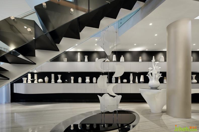 冷冽克制的黑白灰下,強(qiáng)烈的幾何構(gòu)成,形成極具現(xiàn)代感的空間基調(diào),來(lái)自臺(tái)灣著名藝術(shù)家許東榮先生的雕塑作品,為冷靜的空間,注入了一絲不羈的靈魂。