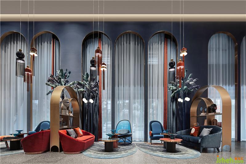洽談區(qū)享有充分的挑高與拱形落地窗,隱約的陽光透過紗蔓,深圳售樓處設(shè)計在坎普風(fēng)般撞色的折射下變成溫柔的漫射,自然為這里的一切加上柔光,人在其中熱鬧與靜默交織。