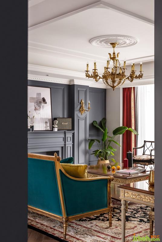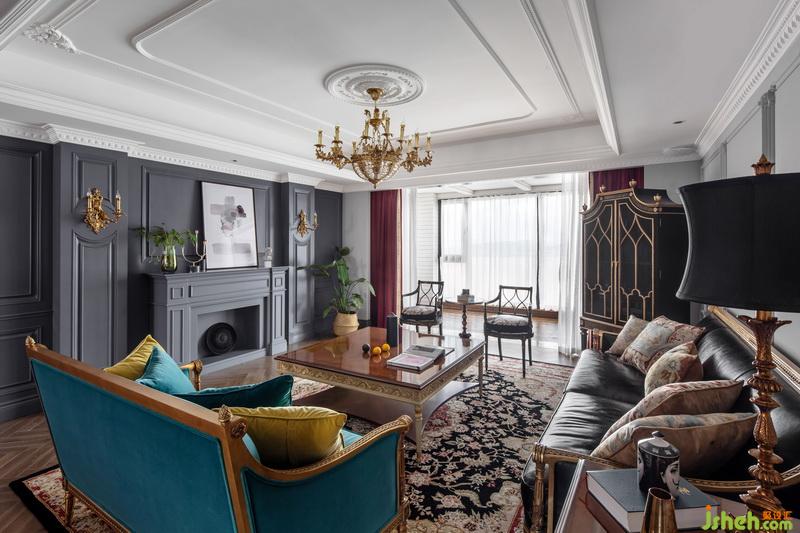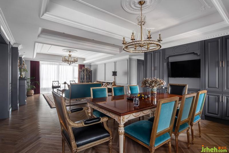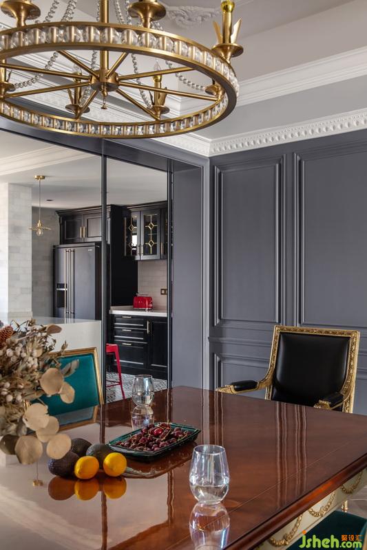 每個(gè)功能區(qū)之間的連接緊密又互相獨(dú)立,寬敞的客廳明亮通透,設(shè)計(jì)師選擇在同一個(gè)色彩體系系中,用孔雀藍(lán)進(jìn)行延伸。灰色系的邊柜中間放置電視,懸掛著的金色水晶吊燈,充滿異域風(fēng)的花紋,讓復(fù)古與現(xiàn)代交替的魅力延伸至此。