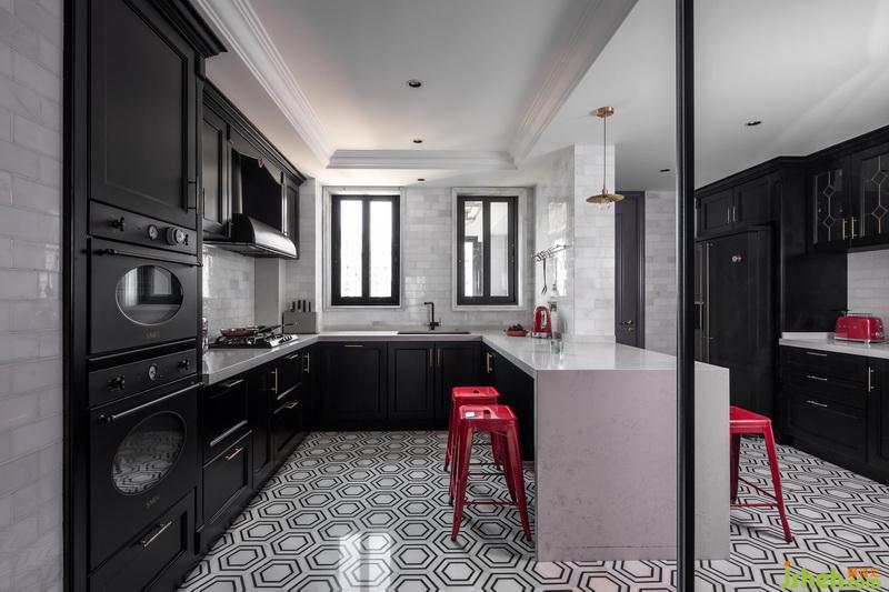 對(duì)于享受料理時(shí)光的屋主來說,寬敞的廚房區(qū)是必不可少的,從儲(chǔ)物柜到中島吧臺(tái),都讓屋主可以自在的大展身手,室內(nèi)設(shè)計(jì)師利用透明的推拉門作為廚房與餐廳的分隔,廚房內(nèi)精致的黑色櫥柜與強(qiáng)烈?guī)缀螆D案地磚,紅色家具與電器點(diǎn)綴其中,營造出豐富的視覺感受。