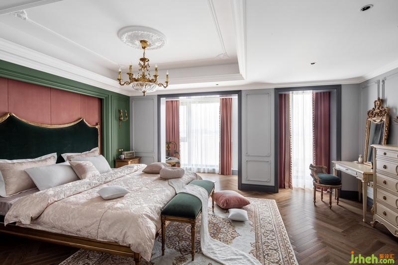 生活中最重要的地方當(dāng)屬臥室,它是我們最能放松下來享受的空間。主臥的視覺中心聚合在床頭背景,皮粉色與綠色形成撞色或互補(bǔ)色調(diào),給予最為直接的視覺沖擊,而純色床上織品與地毯又注入了一點(diǎn)柔美,起到很好的緩和作用。 大面積的落地窗更讓自然光線毫無保留的傾斜入室,獨(dú)特的色彩與微妙的色調(diào)形成了一種平衡與和諧。