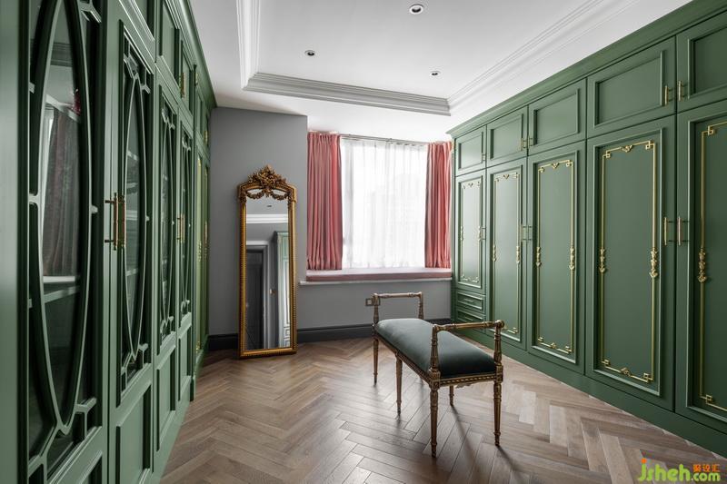 衣帽間選用了房主喜愛(ài)的綠色為主色,同房間粉色窗簾,地面人字拼鋪貼木色地板,上面擺放張換衣凳,復(fù)古的鏡面裝飾,粉、綠、金的搭配讓空間變得更加靈動(dòng)有趣,豐富且優(yōu)雅。