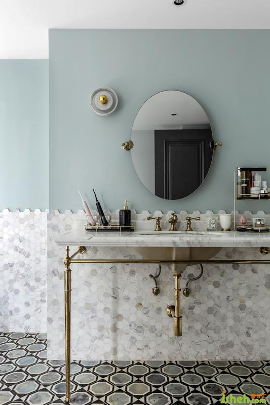 頗具設(shè)計(jì)感的地面彩色瓷磚搶了不少關(guān)注度,墻面則由大理石小瓷磚貼了一半的高度,多余的材料室內(nèi)設(shè)計(jì)師用其擺成雪花的形狀貼上,墻面背景為薄荷綠色乳膠漆,這樣使視覺(jué)上具有層次感,色彩也更加豐富。浴缸支撐腳上雕花具有異域風(fēng),金色衛(wèi)浴在空間里很適合耀眼。在浴缸末端添置一面百葉窗,整體空間即優(yōu)雅也實(shí)用,一切都剛剛好!