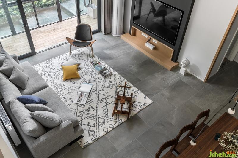 在二樓以俯視的角度拍攝客廳全貌,灰色布藝沙發(fā)與北歐風(fēng)地毯上,藍黃色抱枕作為跳色活躍了整個空間