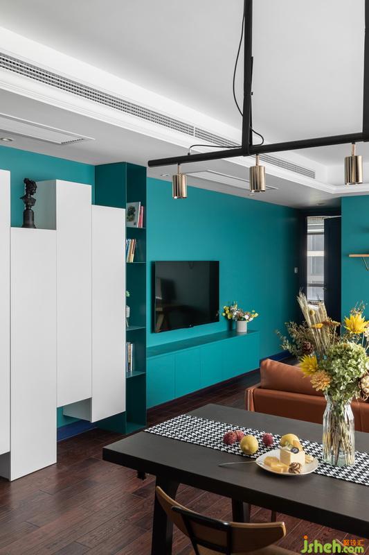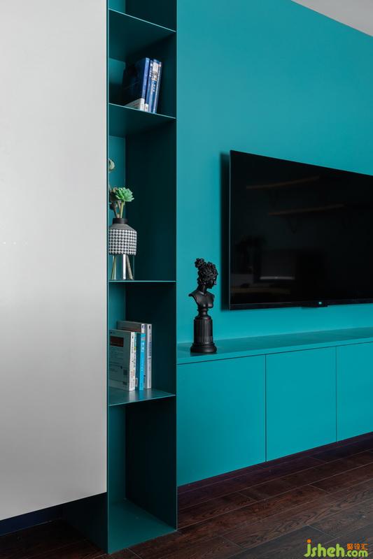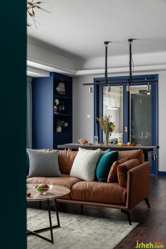 要如何挽救保留紅棕色地板后的壓抑感,設(shè)計(jì)師重在色彩搭配上面下功夫。使用冷色系如藍(lán)色墻面柜體等,形成強(qiáng)烈的視覺(jué)對(duì)比沖擊,讓我們視覺(jué)上移,減少地面對(duì)空間造成的壓抑。暖色系如地板沙發(fā)等紅棕色,中間色如黑白色。最后運(yùn)用這些進(jìn)行組合,得出一個(gè)高色彩對(duì)比度的作品。