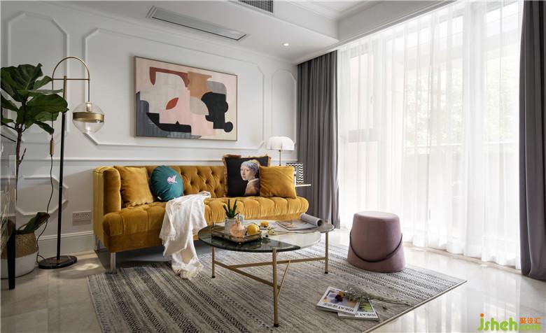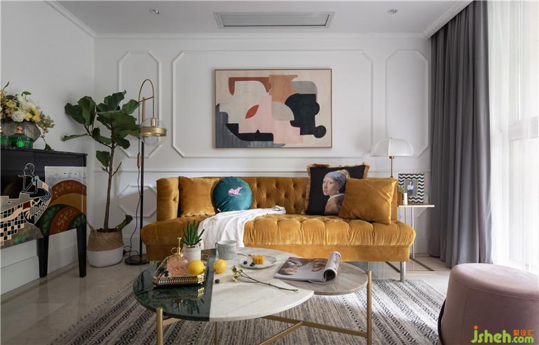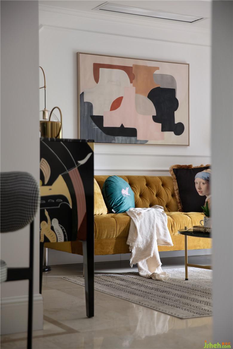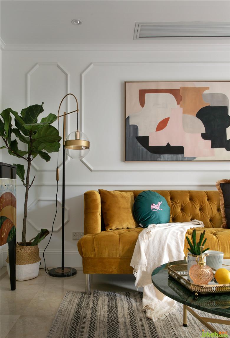 將墻面的墻紙和電視背景墻進(jìn)行拆除,墻面批膩子后做了線條做裝飾。軟裝搭配上,亮黃色沙發(fā)是整個空間視覺的焦點,裝飾畫與沙發(fā)邊柜風(fēng)格相呼應(yīng),充滿了摩登與藝術(shù)感。