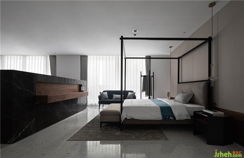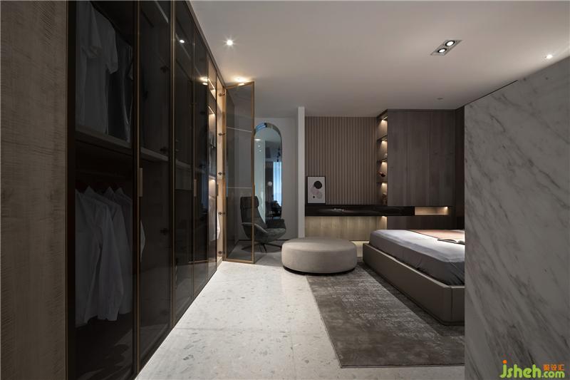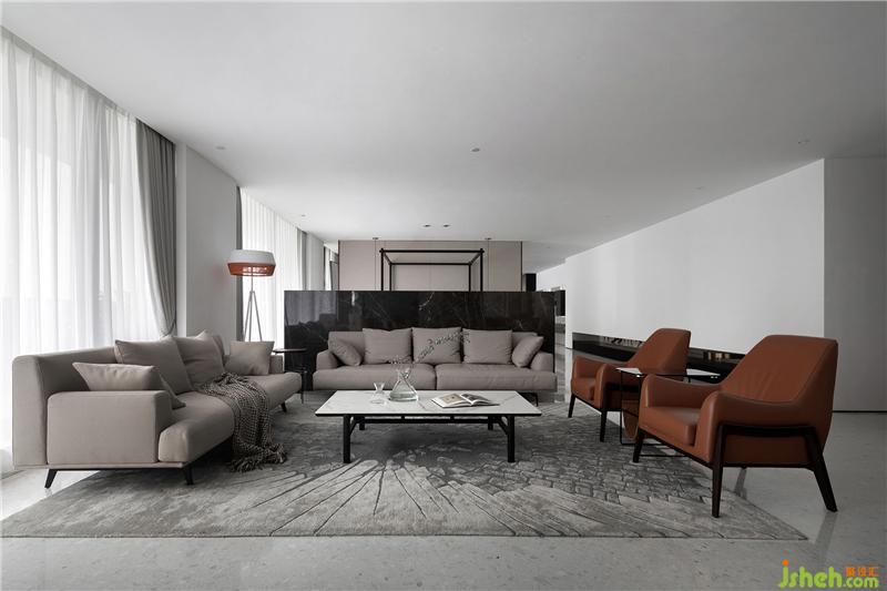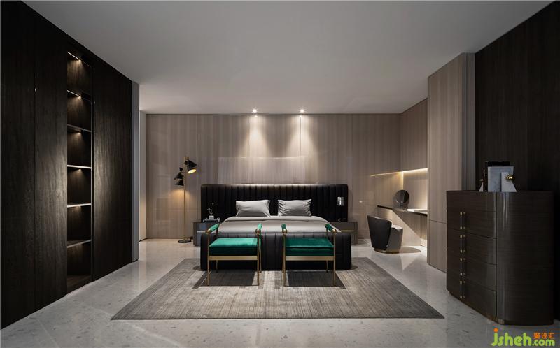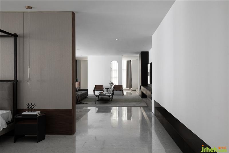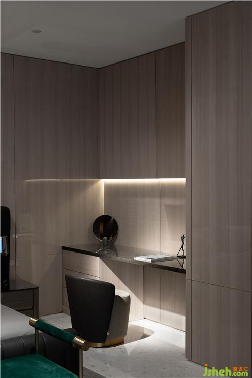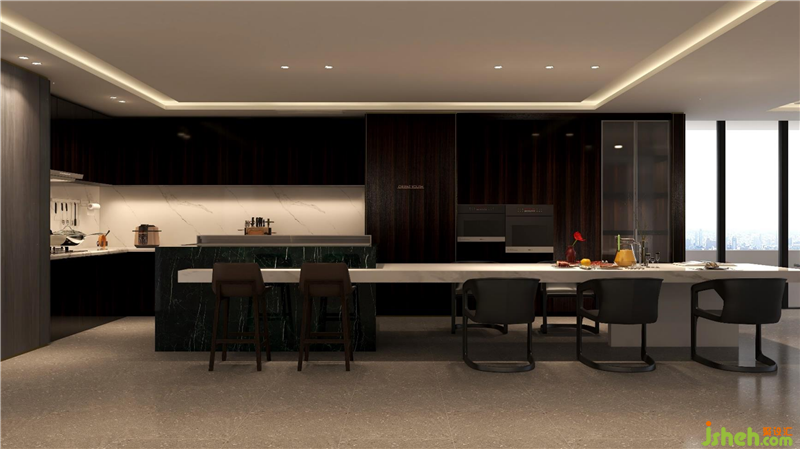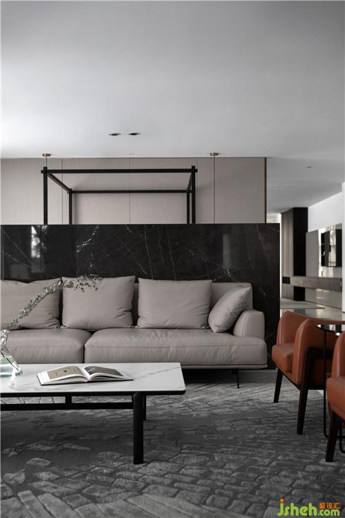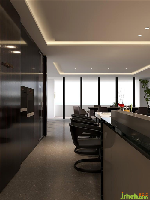 最后是餐廚會客廳,醒目的紅色壁畫,低調奢華的黑色櫥柜,無主燈設計。利用墻體和材質之間落差,來進一步強調空間的視覺縱深感和層級遞進關系。會所設計