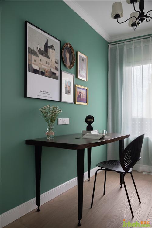 木質(zhì)矩形桌面倚墻而設(shè),墻面用了綠色,可以緩解眼疲勞,墻面上的裝飾畫(huà)既美觀又能讓這一區(qū)域看起來(lái)具有裝飾效果,一旁的窗戶則給予這間書(shū)房較為明亮的自然采光。室內(nèi)設(shè)計(jì)師