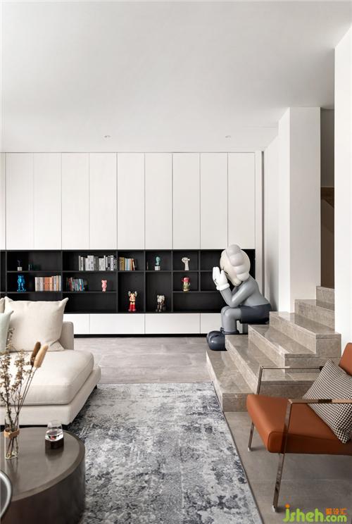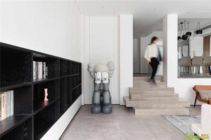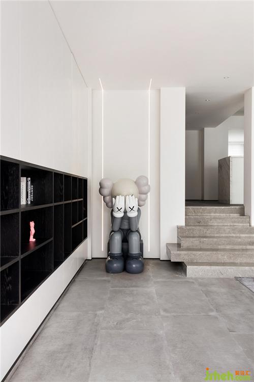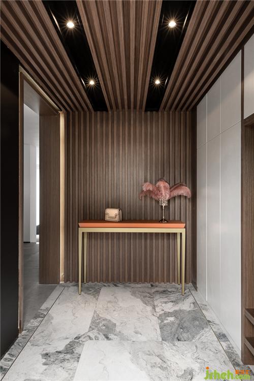 玄關立面和頂面的線條杭州別墅裝飾設計,采用同一材質同一元素達到視覺延伸效果。