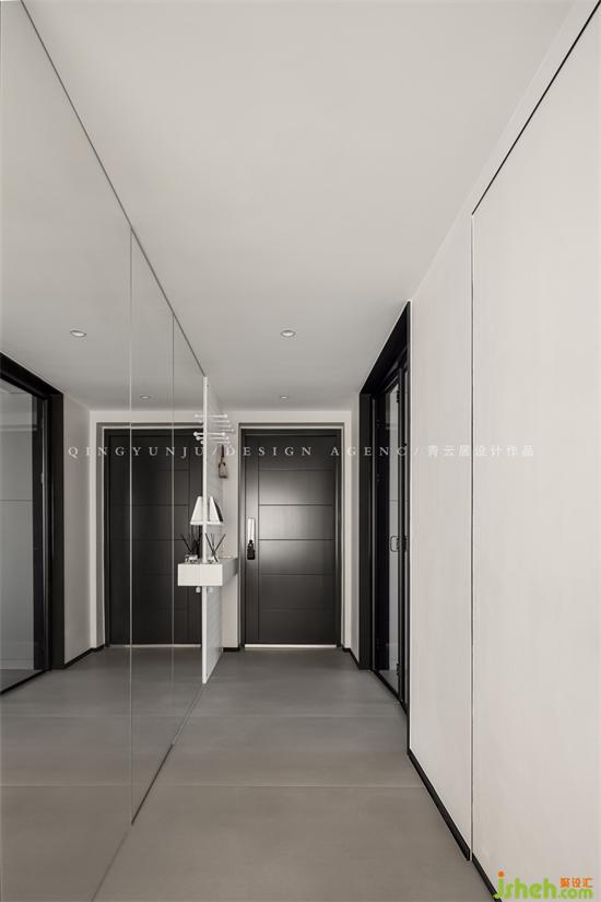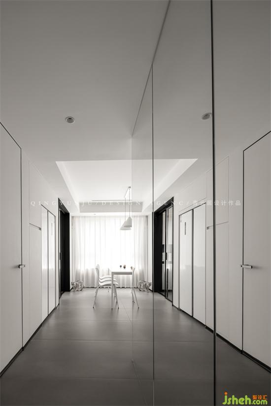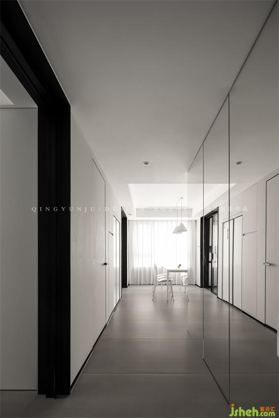 The original corridor was long and narrow, and the light was poor; the designer designed a folded glass door to let the light shuttle in, making the corridor brighter and more visually spacious. The mirror door is used to hide the second guard, making the whole space larger and more spacious.