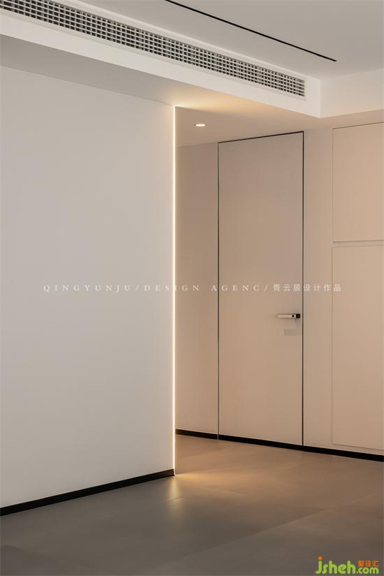 原本的走廊長且狹小,光線較差;室內(nèi)設計師設計了一個折疊的玻璃門,讓光線穿梭進來,使走廊光線明亮,視覺上更寬敞,采用鏡面門將次衛(wèi)隱藏起來,讓整個空間更大、更加寬室內(nèi)設計師敞。