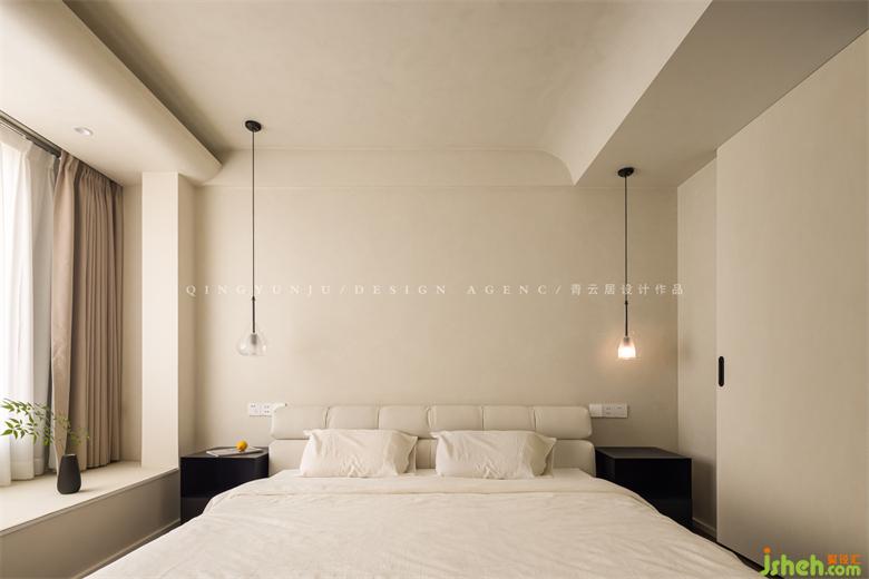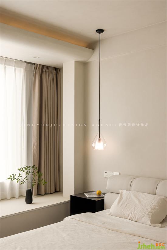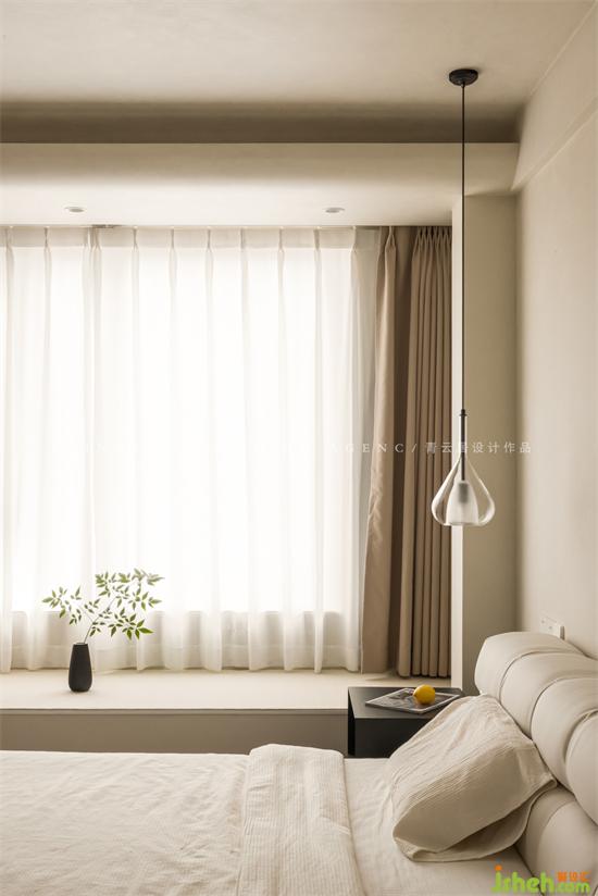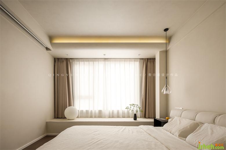 The ceiling is designed with a concave curtain box, and the other side is an arc shape, which hides the light strip, which is beautiful and practical in appearance.