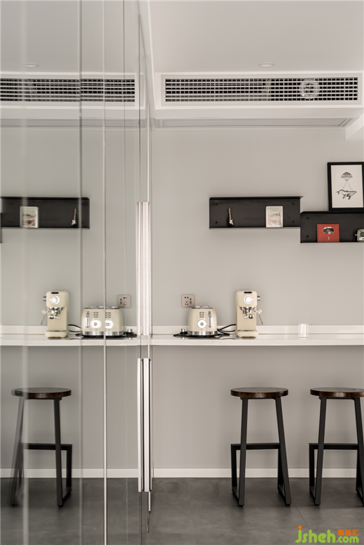 吧臺(tái):水吧臺(tái)是放置一些咖啡機(jī)和面包機(jī)等小電器,墻面錯(cuò)層的置物架,可以滿足隨手拿取水杯及物品。