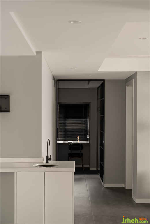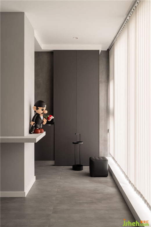 過(guò)道:地面運(yùn)用的是微水泥地磚,深灰色置頂柜與落地窗形成自然的光影效果。