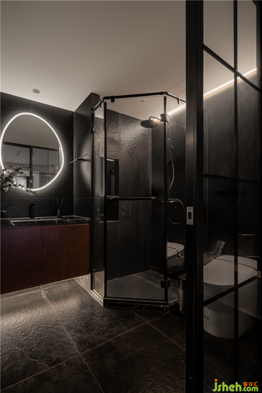 衛(wèi)生間:采用黑色地磚+玻璃,工業(yè)與現(xiàn)代的碰撞,搭配整條燈帶,高級(jí)感和氛圍感同時(shí)拉滿。
