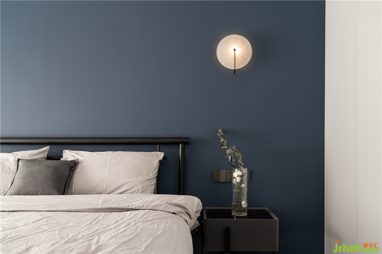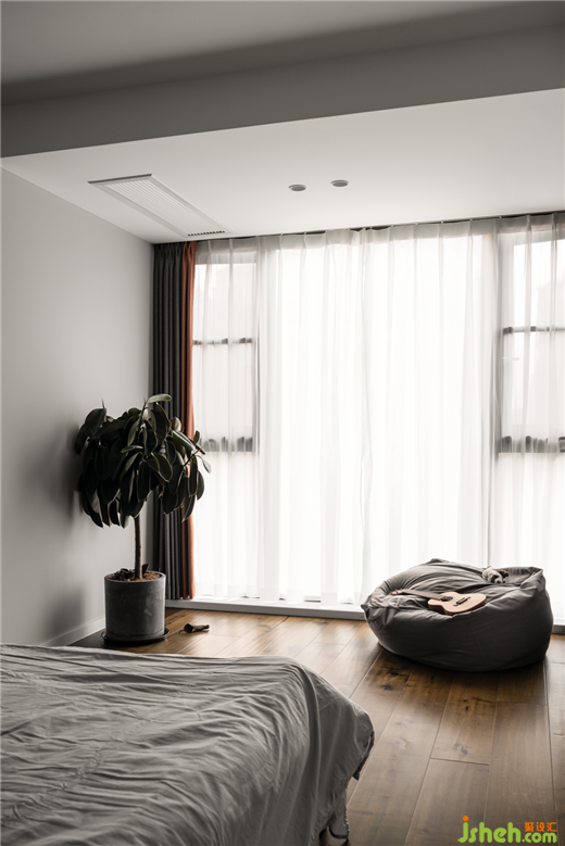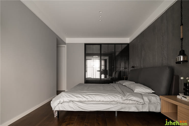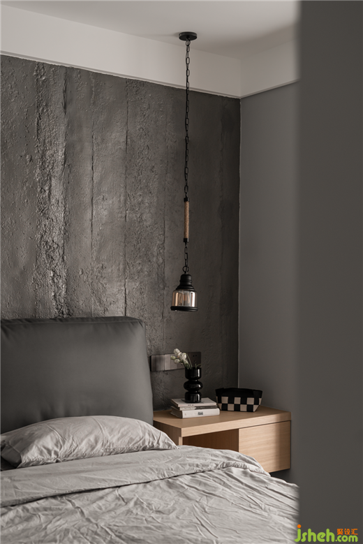 臥室:床頭背景墻采用的是水泥板,色調(diào)相對(duì)較深,搭配原木地板,與定制的家具,素雅低調(diào),打造出靜謐的效果,讓主人回到一個(gè)舒適的休憩空間。