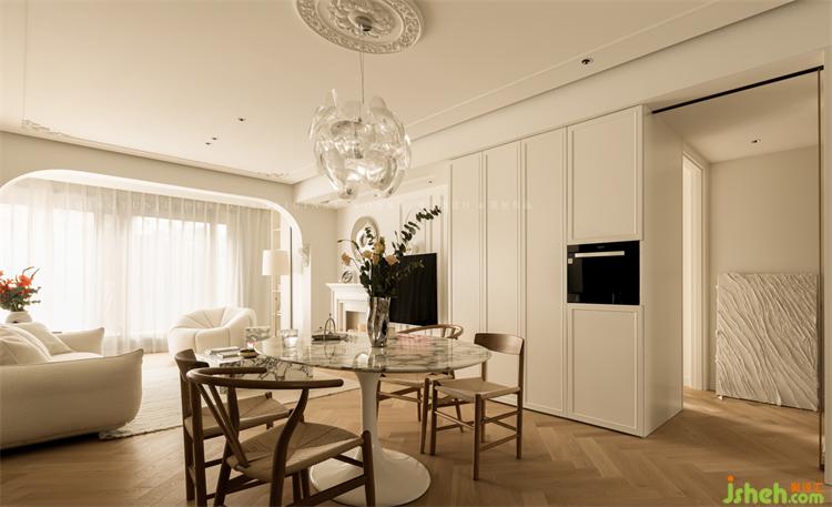 圓形浮雕造型和定制法式吊燈,暖色調(diào)整體營造出優(yōu)雅浪漫的氣氛,在這里用餐也是視覺上的一種享受。