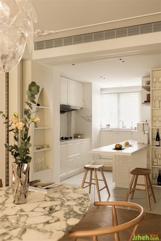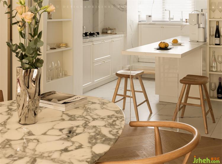 餐廳與廚房設計成敞開式,杭州錦麟府裝修設計整體空間更加寬敞,巖板材質的島臺,將操作區(qū)增加延長,同時可以在這里品嘗美食。