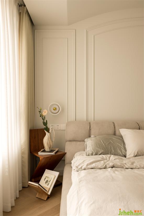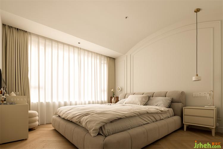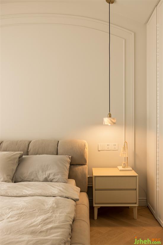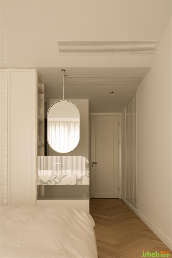 干區(qū)與收納柜組合一體,搭配懸空鏡,既滿足功能需求,又可以起到畫龍點睛的作用。