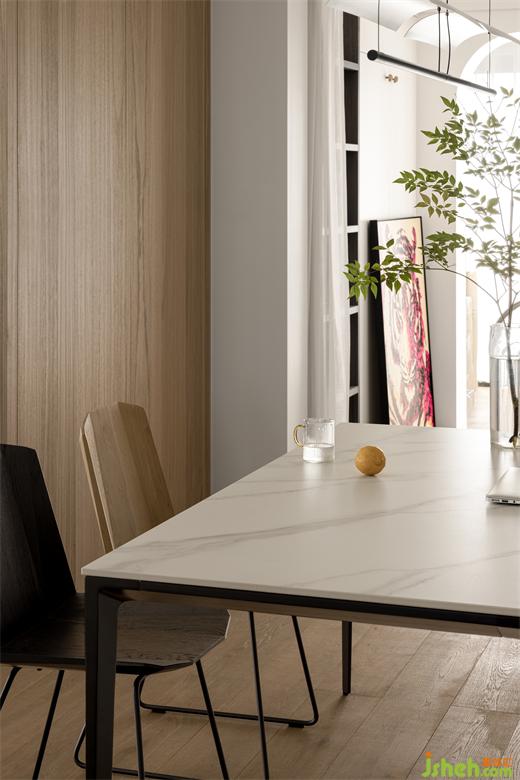 木質(zhì)地板,整體有種在大自然中的感覺(jué),再搭配綠植吊鐘,和簡(jiǎn)約吊燈,自然的光線打在餐桌上,杭州世貿(mào)之西湖家裝設(shè)計(jì)整體環(huán)境顯得格外清爽與溫馨。
