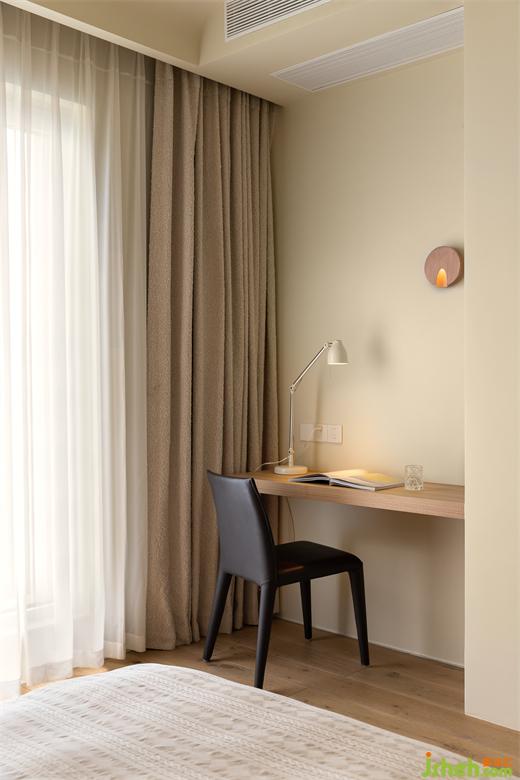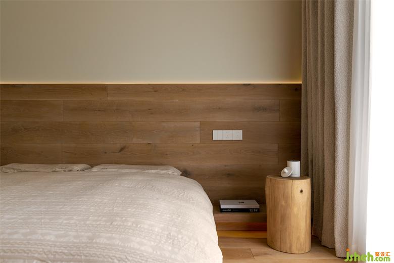 臥室墻面以米色為主,地板和背景墻采用木板裝飾,搭配暖色燈帶,杭州水岸楓庭家裝設(shè)計(jì)整體沒有繁雜的裝飾,自然紋理讓空間兼具了藝術(shù)美感。