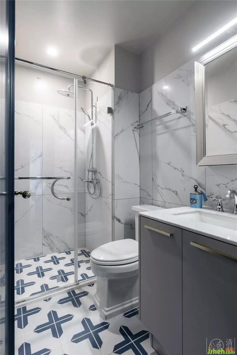 次衛(wèi),女兒房的用了梵高桃花粉和星空藍(lán)來做瓷磚的選擇,人字鋪貼的方式也讓空間在視覺感受上變得不再狹小,有趣而雅致。