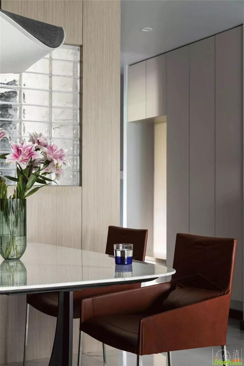 餐廳空間里擺著一張長長的大理石面餐桌,一盞別致的吊燈恰如一片倒掛的荷葉,又似一瓣花瓣。儲物柜旁,拱門造型的鏡子尤為引人注目,一家?guī)卓谧诓煌奈恢?,透過同樣的一面鏡子,看到的一景一物卻是各有差異。設(shè)計巧妙、布置經(jīng)心,讓家里人在享用美食中也似乎多了些許興致。