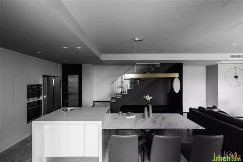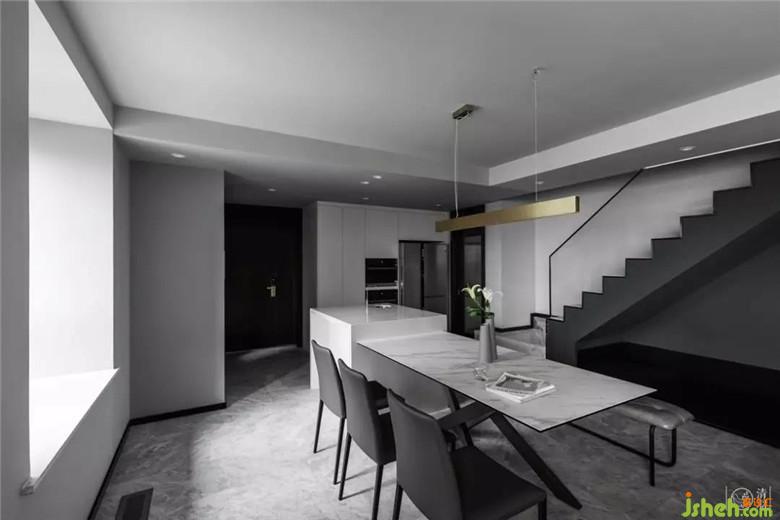 盡管沒(méi)有加入任何隔斷的設(shè)計(jì),通過(guò)燈光布局、軟裝的搭配使這個(gè)區(qū)域可休閑可會(huì)客的氛圍依然濃厚。沙發(fā)與餐桌間留足了70cm的間距,小朋友玩耍跑起來(lái)不容易磕碰,也完美的展現(xiàn)了空間一層層的過(guò)渡關(guān)系。