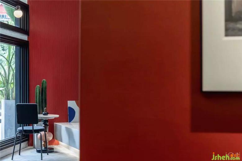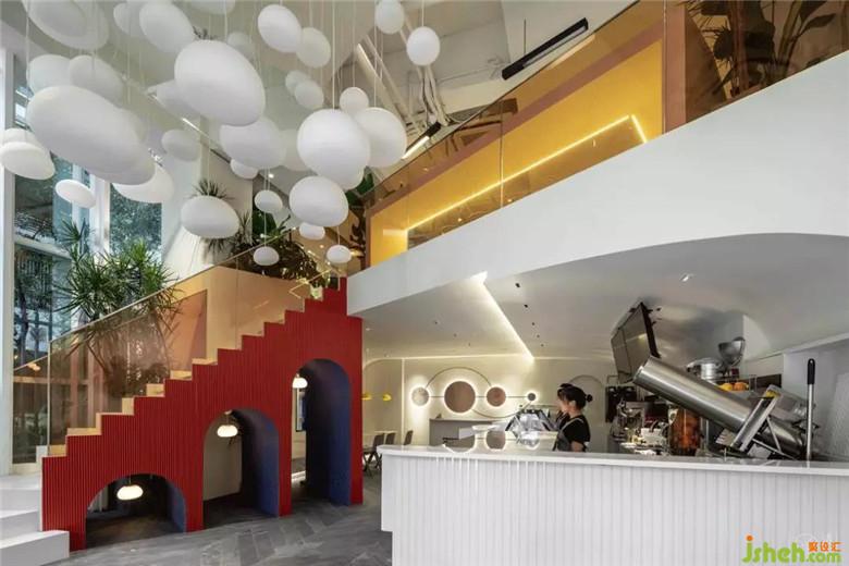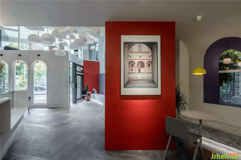 樓梯下方三個(gè)依次增高的拱門,暗示了人生的不同階段。樓梯下面空間的造型拱門以及轉(zhuǎn)角處的芥末黃色吊燈,致敬了蒙德里安的經(jīng)典紅藍(lán)黃配色。