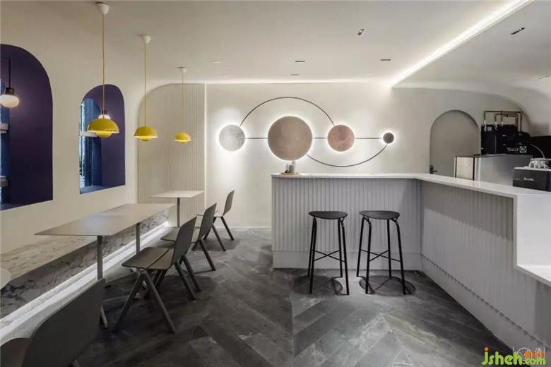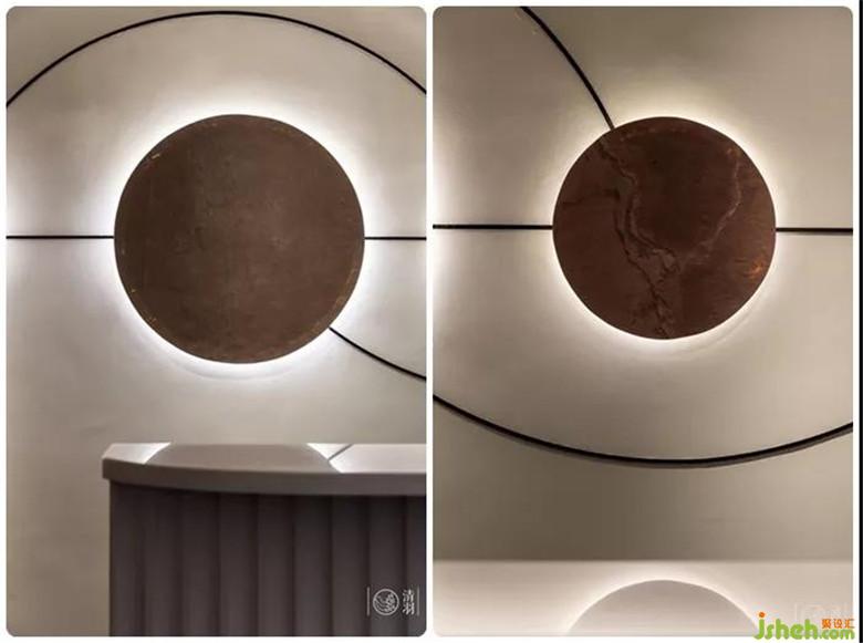 兩個人之間的引力或者“糾纏”,我們稱之為“愛情”,而萬物間的“糾纏”形成了宇宙,它的奧秘人類從沒有放棄探尋。于是,在這樣一個可宏觀可微觀的空間里,在歡聚的桌旁(也是正對大門)的背景墻上,我們用超薄石材、金屬線條組合,進口涂料打底做了一組似乎遵循著某種軌跡相互牽制運動的星球裝置。