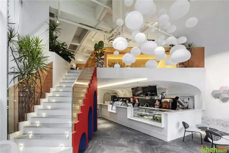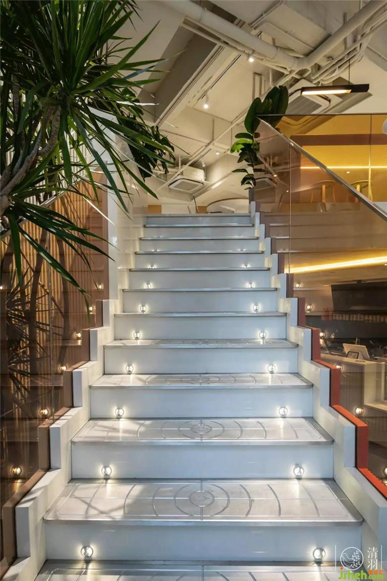 20mm厚的鋁板,結(jié)合Logo定制圖案,出圖送工廠打樣,最后篩選出性價比最高的方案,由此引力食間擁有了“私人訂制”的梯步。因為高度正好,做了12階踏步(貌似不小心帶入了圣斗士十二宮的傳說),定制科瑞燈珠以側(cè)出光的方式,打造一種飛船梯步的感覺,聽說完美的質(zhì)感也能加速多巴胺分泌。