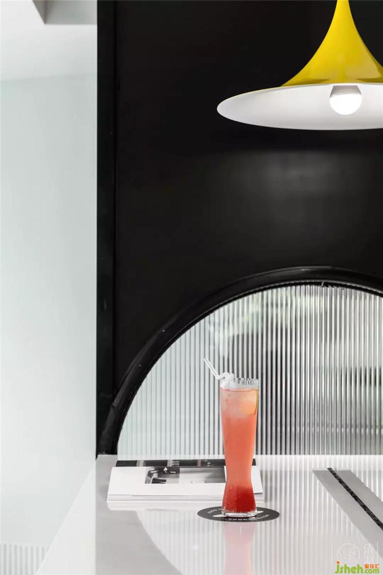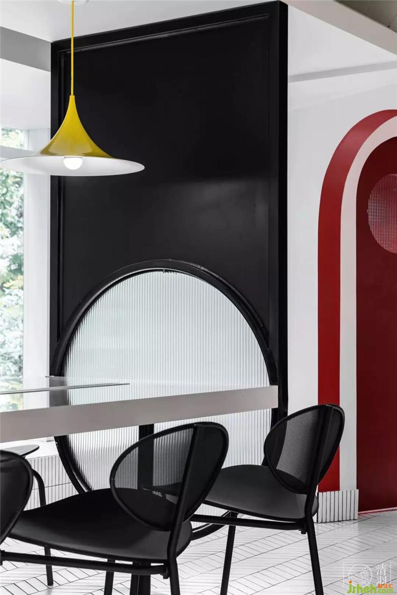 當(dāng)然,餐飲店不得不考慮的就是多人聚餐,因此一張與空間整體風(fēng)格相得益彰的大桌子是必備。稍大面積的灰白拼色石材桌面,不會(huì)顯得突兀,在某種角度也給人一種行星墜落既視感,不失趣味。