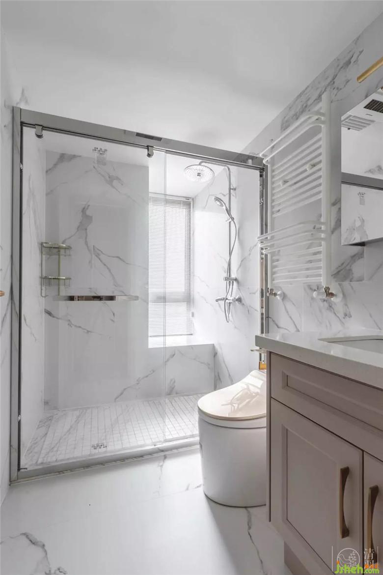 空間不大的次衛(wèi),我們延續(xù)了淺色系的色彩搭配。干濕分區(qū),淋浴區(qū)內(nèi)導(dǎo)水槽和防滑槽的處理,做到了以人為本。