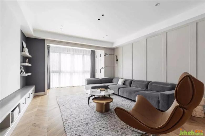 地板是木色。一般這種風(fēng)格,大家都會(huì)用很多成品木飾面。但我們不想把家做成小型muji賣場(chǎng)。因此,用了大塊的不凸顯木紋的啞光實(shí)木護(hù)墻板做立面空間。再則,她選的沙發(fā)非常有質(zhì)感,我們也希望背景退后,不要喧賓奪主。