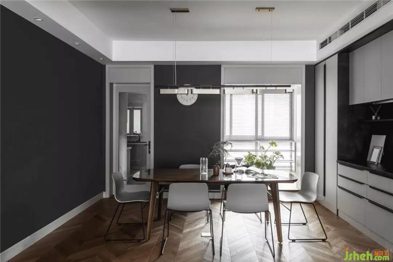 餐廳區(qū)域,墻面用黑色乳膠漆,和黑板漆呼應(yīng),在轉(zhuǎn)角做了分色處理,用簡單的辦法增加圍合感,墻面基本沒有淺色卻絲毫不顯突兀。